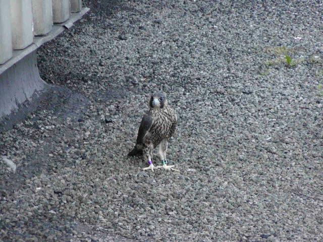 This is Brook the young male who was "grounded"(uninjured). He was R&R and banded by Dave Hogan, Master Falconer, Pres. MI Hawking Club. (Dave lives in Monroe and can get to the plant quick for falcon rescue). Karen Young (Huron Valley Bird Rescue) also, "stands-by" for my sites!