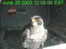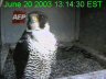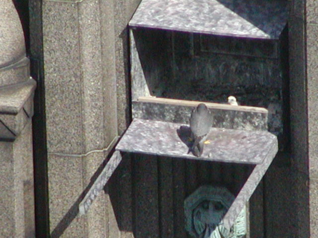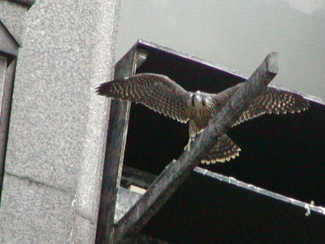 14 June - Cadette (wp) (b/g 73/B 987-40116 was "blown (backwards) off the perch pole by a strong gust of wind that accompanied a storm at 1 P.M.! Luckily he landed on the 4th floor ledge directly below the nest box! He was fed later by Alpha.