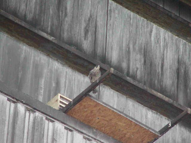 This is the young (banded) female, Flitie. Behind her is the emergency nest box that was used for grounded fledglings to "get their bearings". It had just a flat platform as (up to this year) the fledglings were ready to really fly). Flitie had attempted flight too early (needed a few more days to "develop-muscle"). Dave added the sides and "railed" front to the box (ala New Center box style). Flitie is, now, out and about flyin' with her siblings!